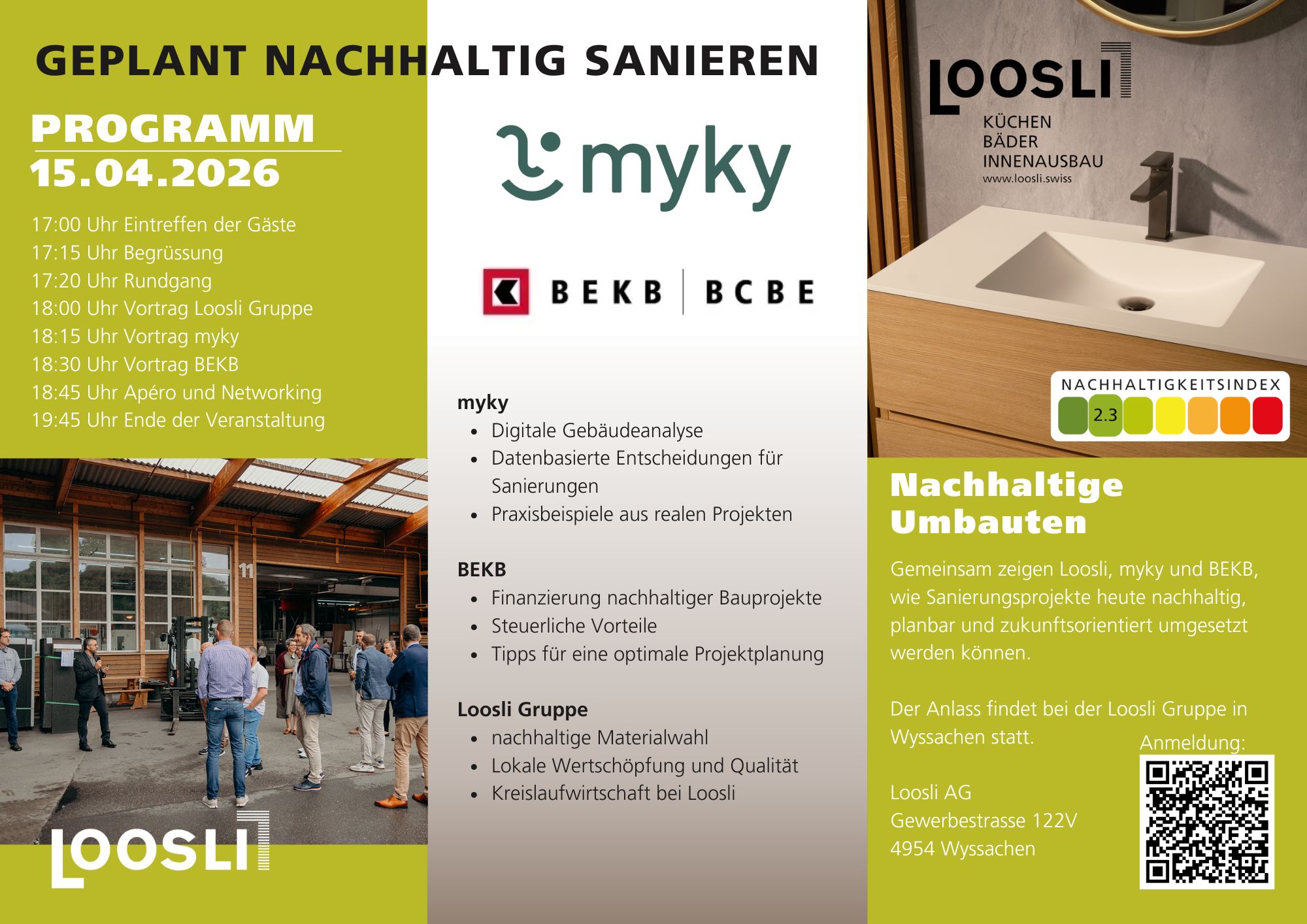 Gemeinsam mit der BEKB und der Plattform myky lädt Loosli zu einem informativen Anlass rund um das Thema nachhaltige Gebäudesanierung ein. Fachpersonen zeigen auf, wie eine Sanierung strukturiert geplant und effizient umgesetzt werden kann. Dabei werden sowohl praktische Aspekte der Umsetzung als auch Finanzierungsmöglichkeiten und digitale Planungstools vorgestellt.