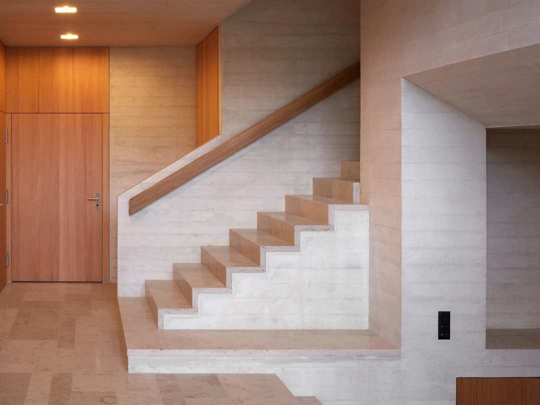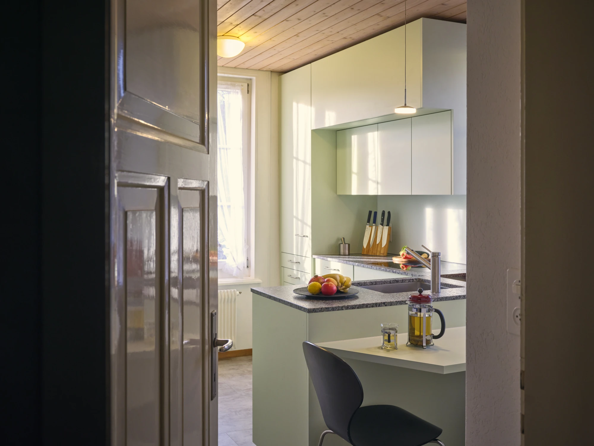 Mit viel Gespür für Details wurden originelle Lösungen umgesetzt, etwa ein altes Hoftor als Tür zum Schlafzimmer. Nach dem Motto «Weniger ist mehr» kamen bewusst wenige Materialien zum Einsatz, sichtbar bei der Wendeltreppe und der zurückhaltend gestalteten Garderobe. Die helle offene Küche erfüllt den Wunsch nach einer modernen Raumwirkung.